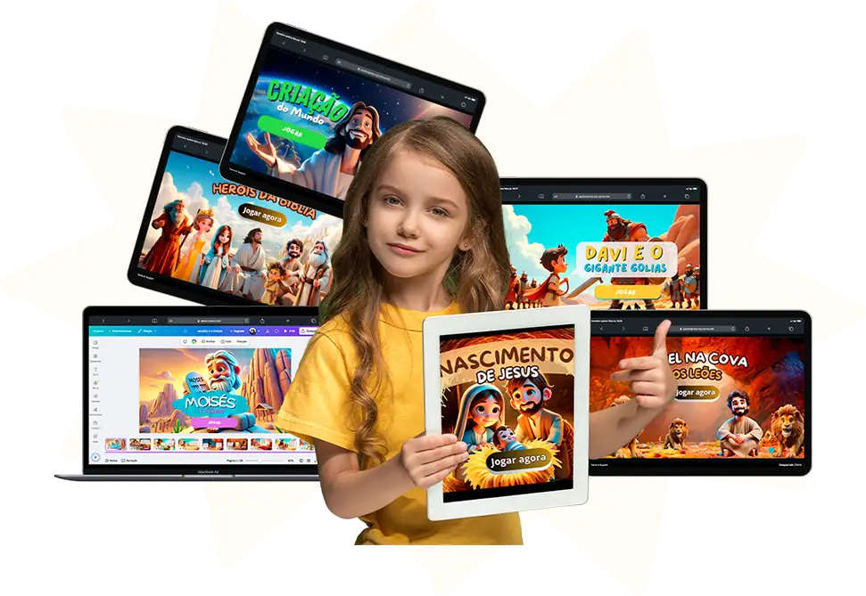 Apresentamos o Play Kids Cristão, uma plataforma com 10 jogos bíblicos interativos que transformam o tempo de tela das crianças em momentos de aprendizado, fé e alegria!